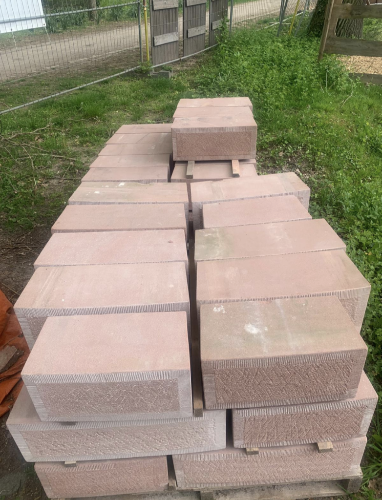 Heimlich, still und leise wurde heute die größte Einzelbauleistung seit langem erbracht: Die Steinwand, die seit der Ausgrabung der Lunette den Eingangsbogen stützte, verschwand hinter großen Sandsteinen: Die fehlenden Treppenstufen sind wieder da.